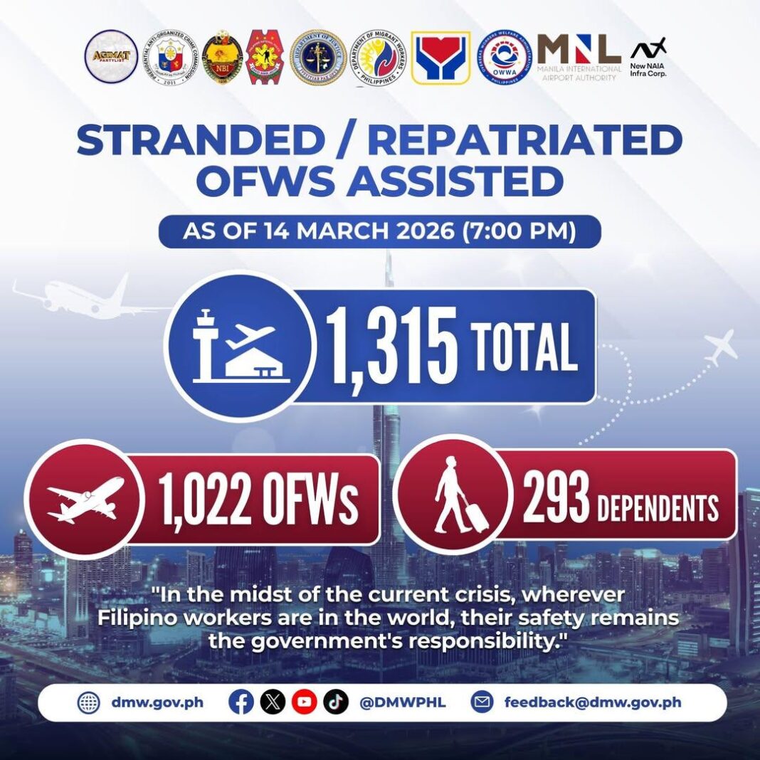 Batay sa datos ng DMW, kabilang sa mga nakauwi mula March 5 hanggang March 14, 2026 ang 1,022 OFWs at 293 dependents na na-stranded o isinailalim sa Bagong Pilipinas Repatriation Program ng administrasyon ni Pangulong Ferdinand R. Marcos Jr.