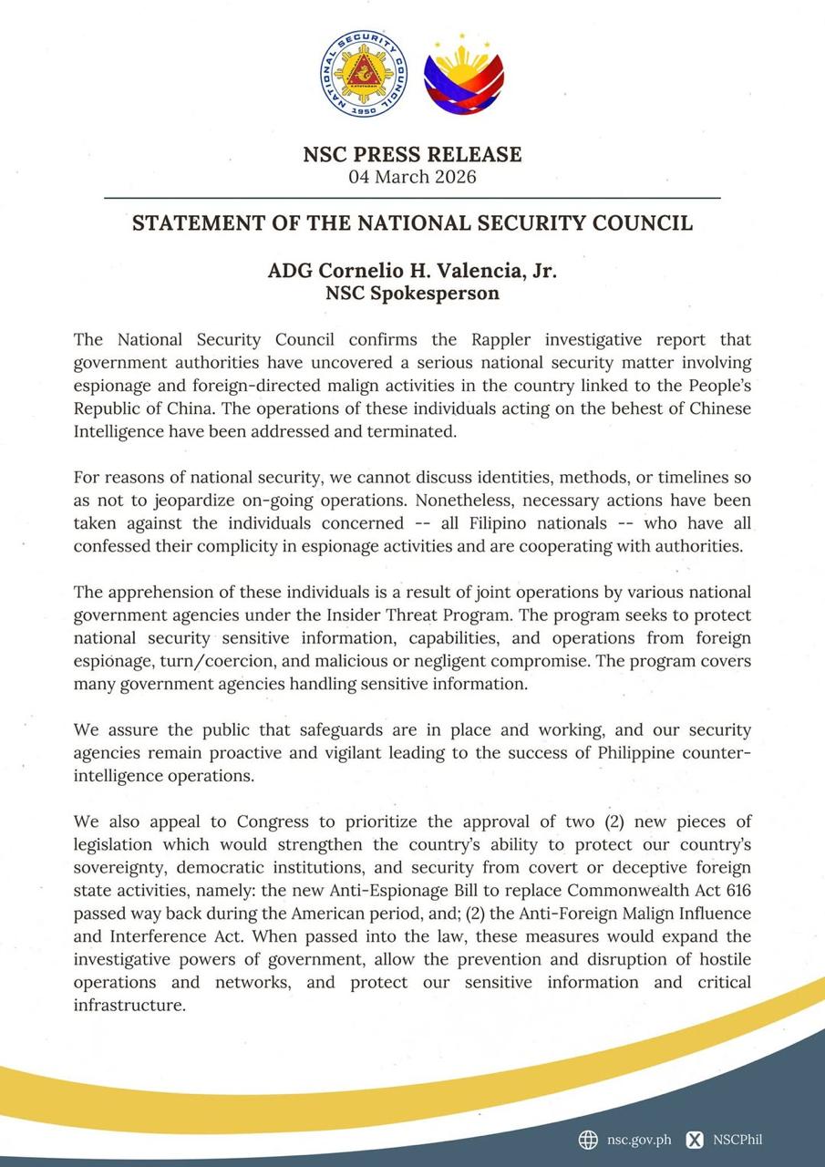 Sa pahayag ni NSC spokesperson Assistant Director General Cornelio H. Valencia Jr. noong March 4, sinabi ng konseho na natuklasan ng pamahalaan ang “espionage and foreign directed malign activities in the country linked to the People’s Republic of China.”