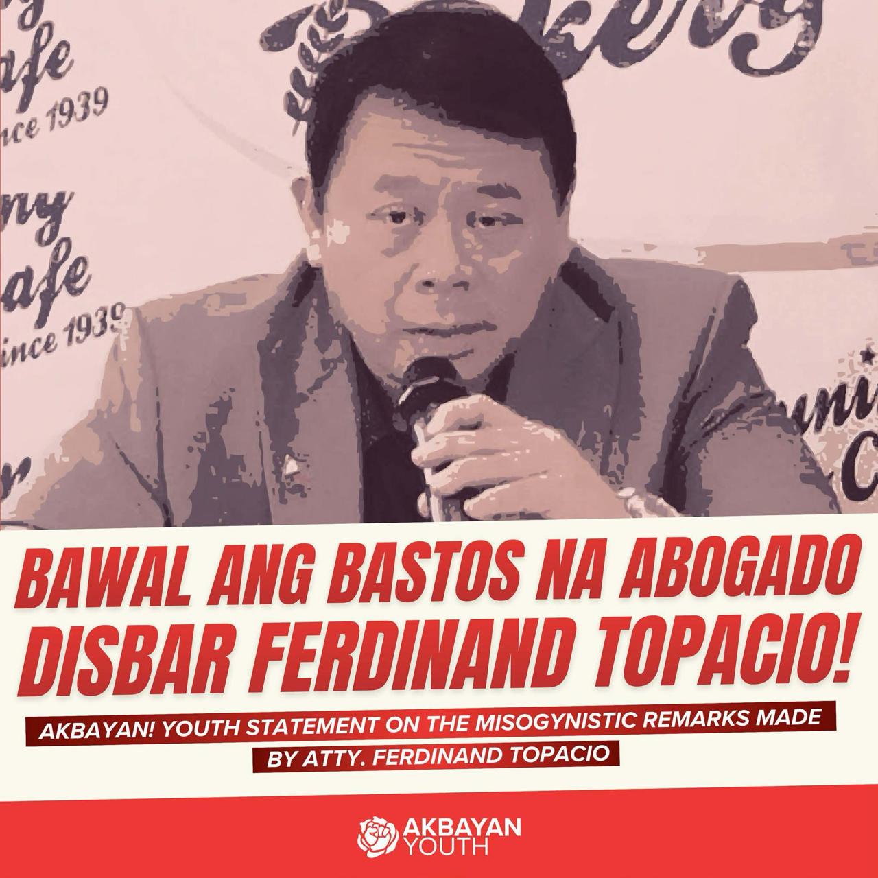 Sa isang pahayag, nanawagan ang Akbayan Youth sa Korte Suprema na kumilos laban sa abogado at suriin kung ang asal nito ay naaayon pa sa pamantayan ng ligal na propesyon.