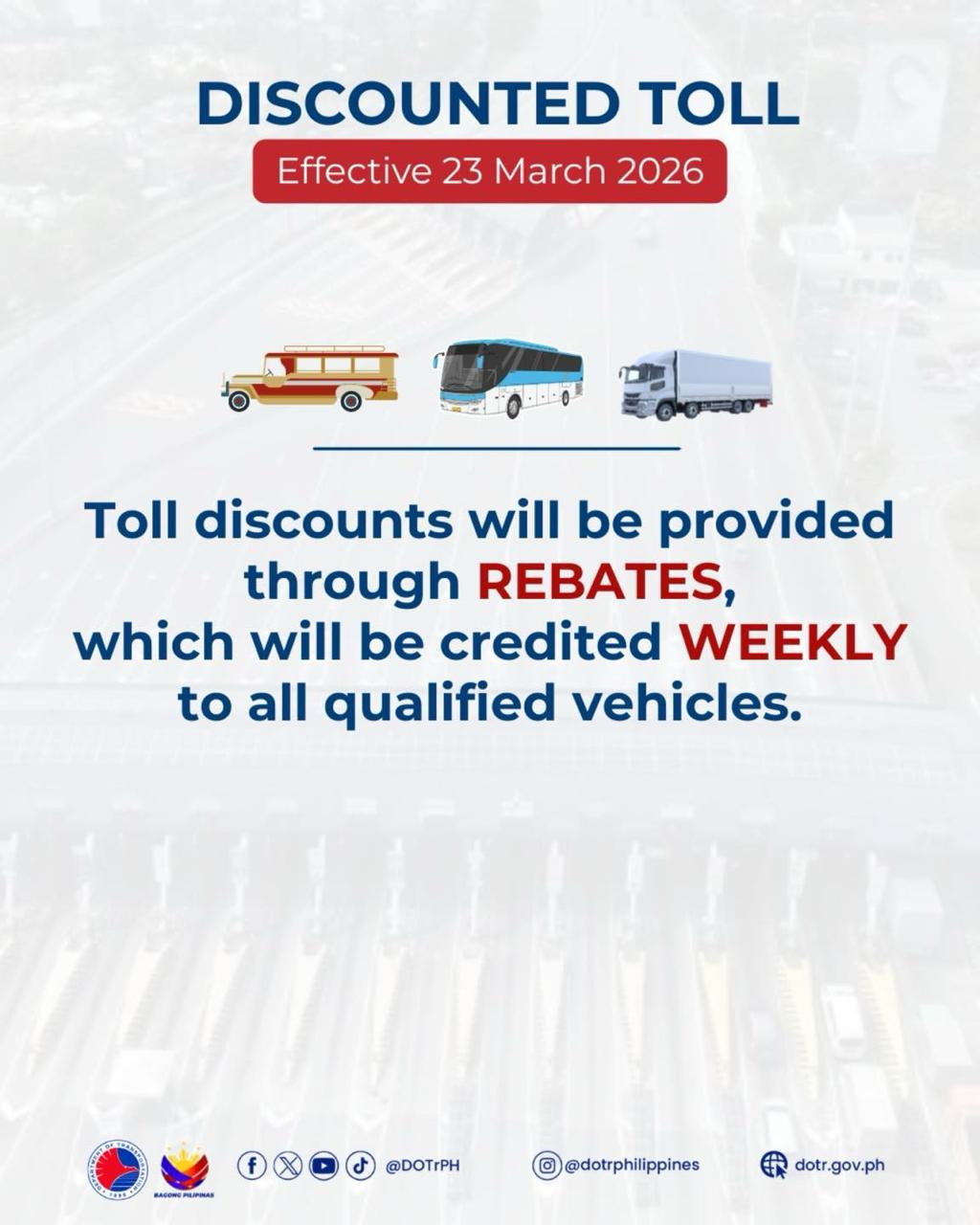 Magpapatupad ng pansamantalang diskwento sa toll fees para sa mga pampasaherong sasakyan at freight vehicles simula March 23 bilang tugon sa pagtaas ng presyo ng langis, batay sa anunsyo ng Department of Transportation (DOTr).