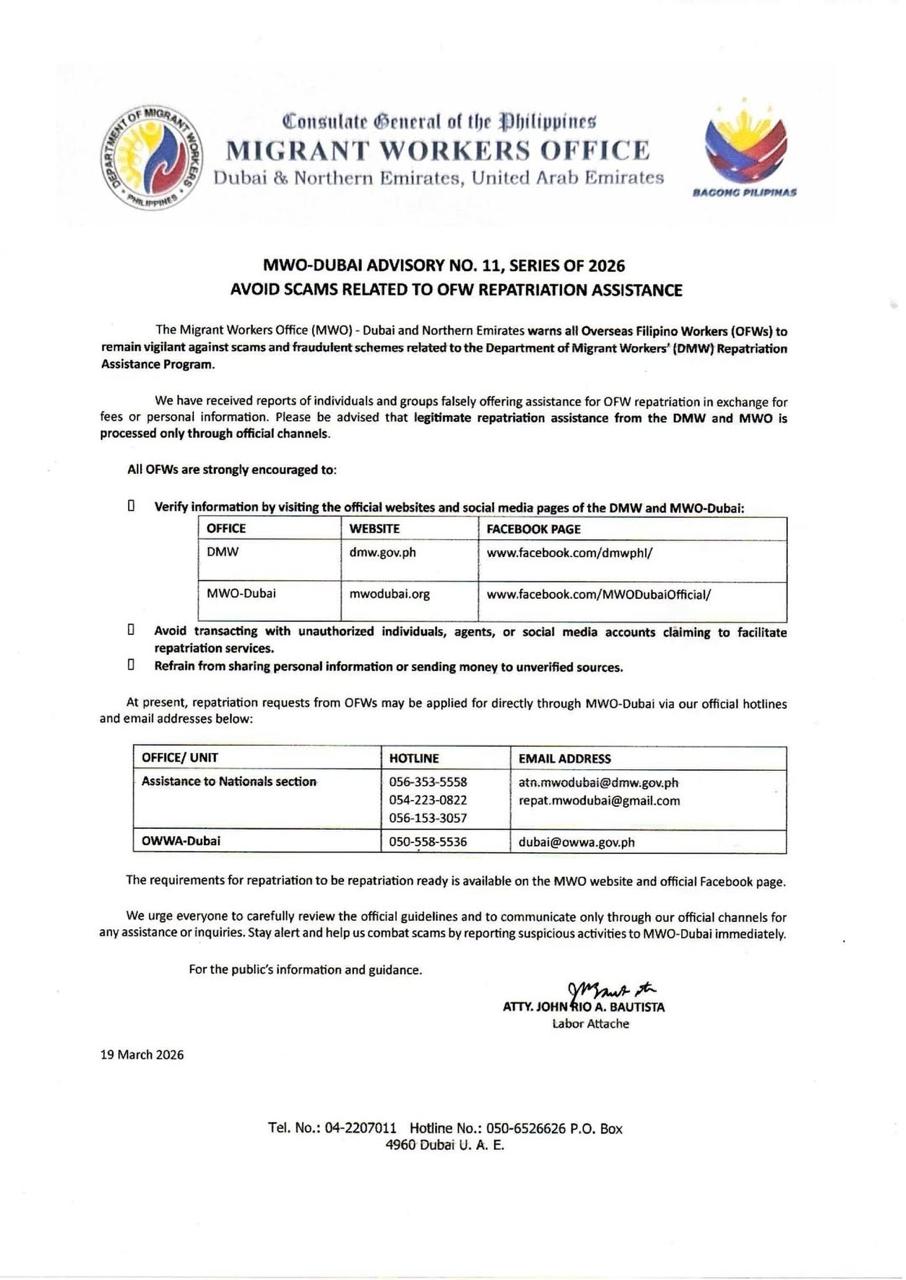 Nagbabala ang Migrant Workers Office (MWO) sa Dubai at Northern Emirates sa mga Overseas Filipino Workers (OFWs) laban sa mga scam na kaugnay ng repatriation assistance ng Department of Migrant Workers (DMW), kasunod ng mga ulat ng panloloko na lumalaganap sa gitna ng nagpapatuloy na Middle East conflict.