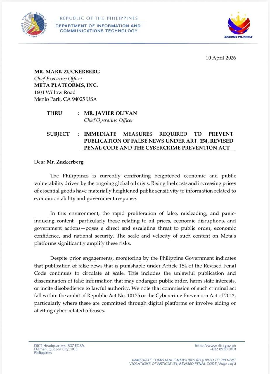 Sa isang liham noong April 10 mula sa Department of Information and Communications Technology, ipinaabot kay Meta CEO Mark Zuckerberg ang panawagan para sa “immediate measures required to prevent publication of false news.”