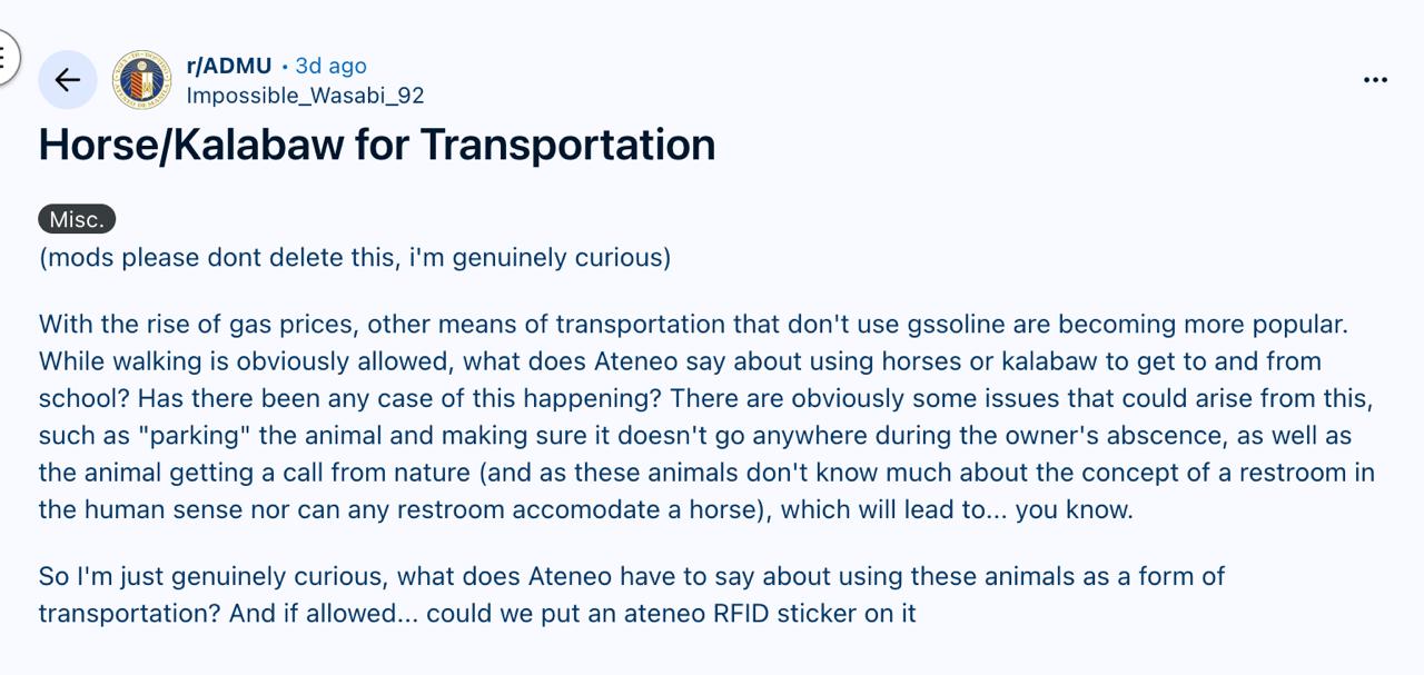 Sa isang post sa social media site na Reddit, nagtanong ang isang netizen sa komunidad ng mga Atenista kung posible bang gumamit ng kabayo o kalabaw bilang paraan ng transportasyon papunta at pauwi ng paaralan.