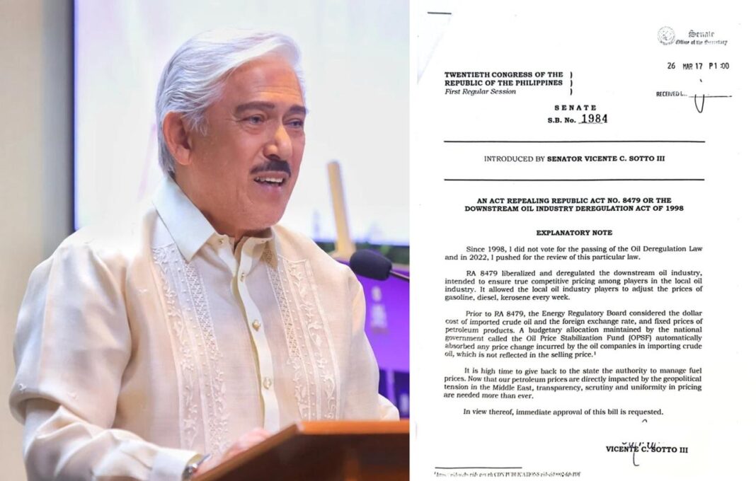 Pinapabasura ni Senate President Vicente “Tito” Sotto III ang Oil Deregulation Law matapos ihain ang panukalang tuluyang magre-repeal sa Republic Act No. 8479, ang batas na nagliberalize ng presyo ng produktong petrolyo sa bansa.