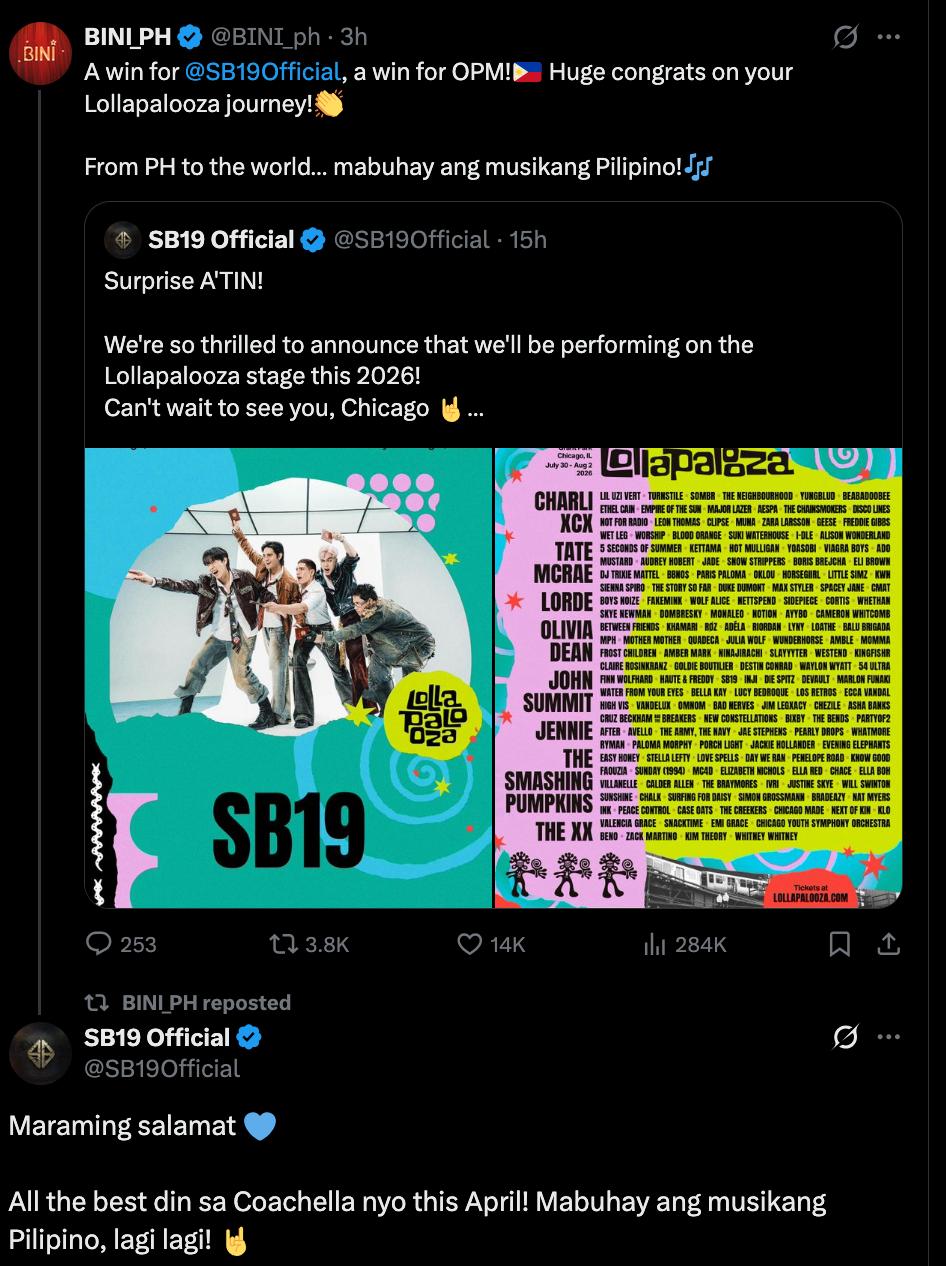 Sa gitna ng mga anunsyo, nagpalitan ng mensahe ang dalawang grupo sa social media. Sa isang post sa x, sinabi ng BINI, “A win for @SB19Official, a win for OPM! Huge congrats on your Lollapalooza journey! From PH to the world… mabuhay ang musikang Pilipino!”
