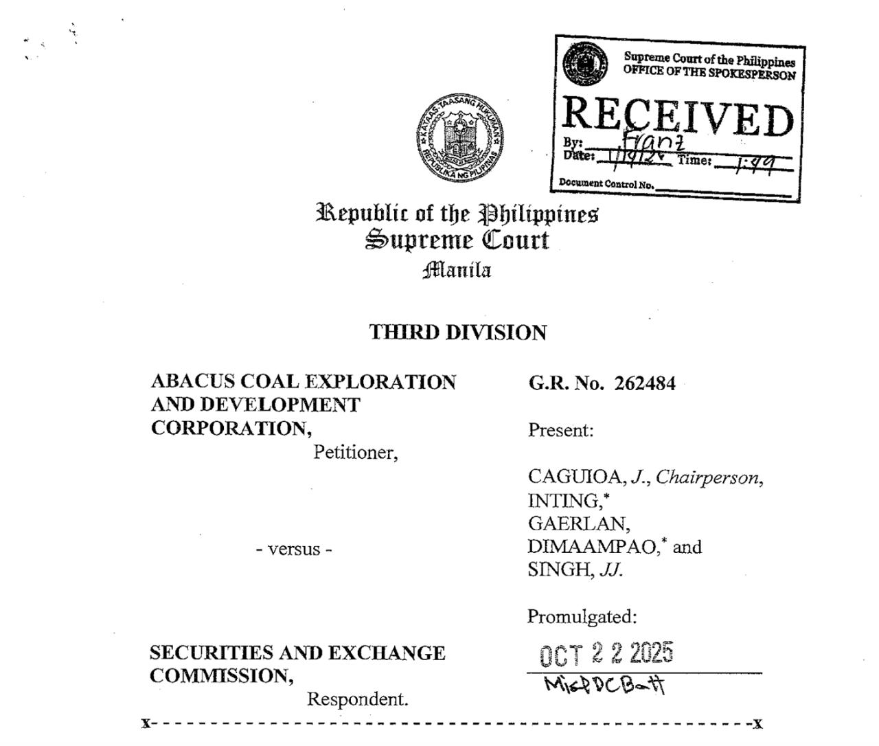 Sa desisyong isinulat ni Associate Justice Maria Filomena Singh, ibinasura ng Third Division ng Korte Suprema ang petisyon ng Abacus Coal na kumukuwestiyon sa naunang desisyon ng Securities and Exchange Commission (SEC) na nagpataw ng multa sa kumpanya.