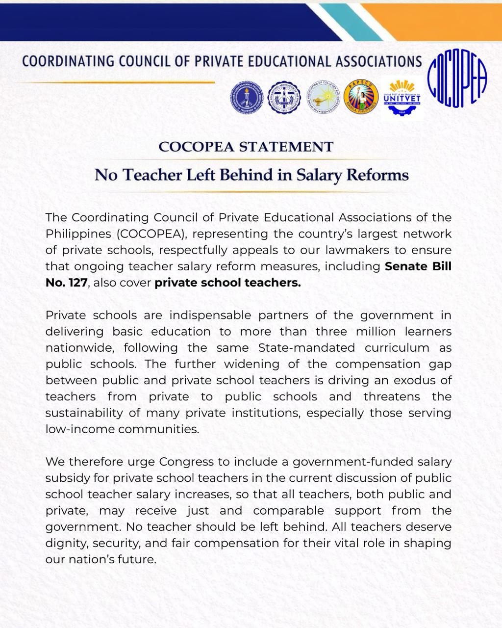 “[COCOPEA] respectfully appeals to our lawmakers to ensure that ongoing teacher salary reform measures, including Senate Bill No. 127, also cover private school teachers,” pahayag ng grupo.