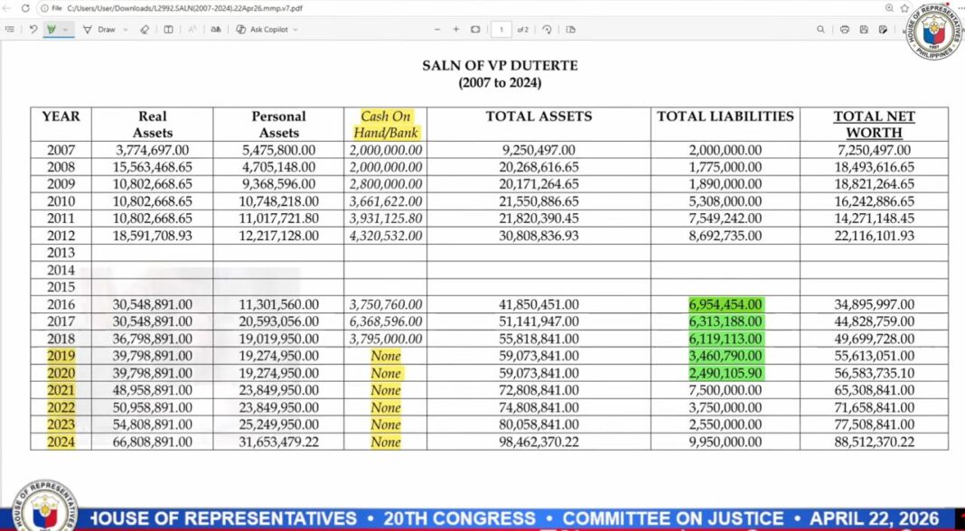 Lumobo nang higit sampung beses ang idineklarang net worth ni Vice President Sara Duterte mula 2007 hanggang 2024, bagay na naging sentro ng tanungan sa pagdinig ng House Committee on Justice nitong April 22.