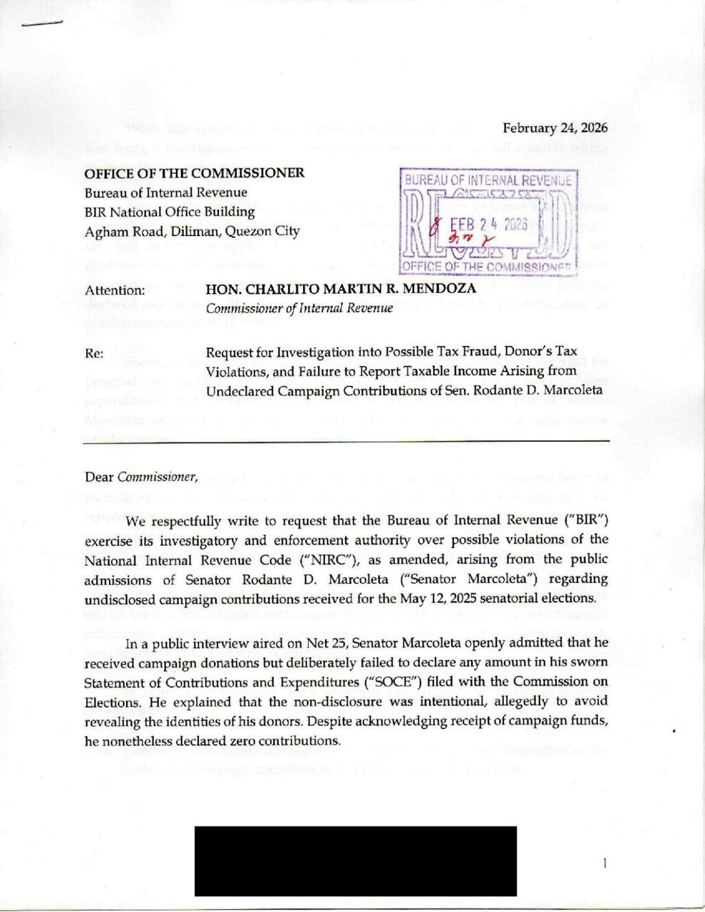 Sa liham na may petsang February 24 kay BIR Commissioner Charlito Mendoza, sinabi ng Kontra Daya at Advocates of Public Interest Law na ang pag-amin ni Marcoleta na hindi niya idineklara ang campaign contributions na natanggap niya noong nagdaang eleksyon ay may “substantial tax implications that fall squarely within the jurisdiction of the BIR.”