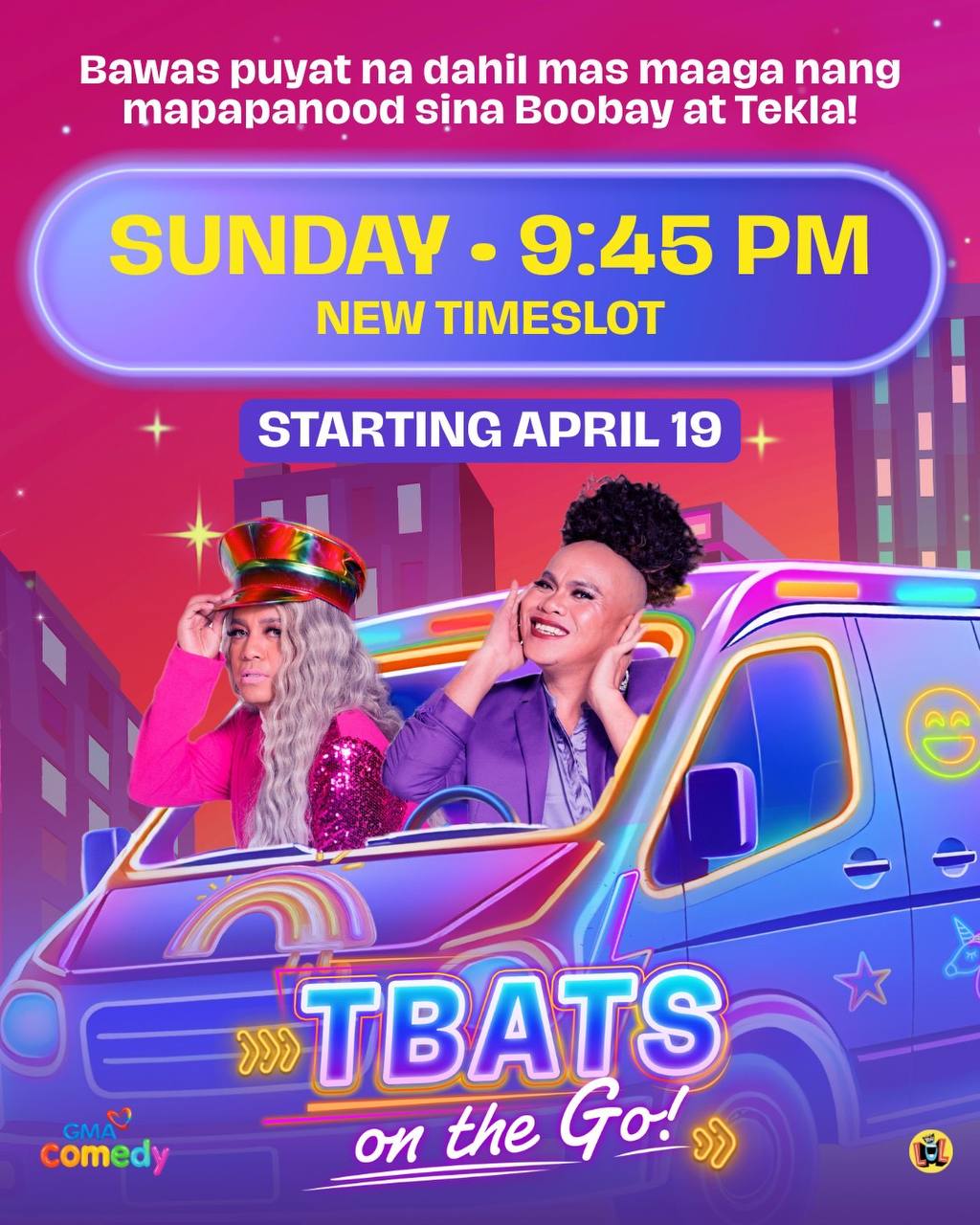 Bawas puyat na dahil mas maaga nang mapapanood ang favorite comedy duo ng mga Kapuso na sina Boobay at Tekla. Simula April 19, mapapanood ang “TBATS on the Go” sa bago nitong timeslot na 9:45 p.m.