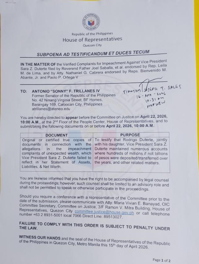 Tinanggap na ni dating Senador Antonio “Sonny” F. Trillanes IV ang subpoena mula sa House Committee on Justice na nag-uutos sa kanyang humarap sa impeachment hearing laban kay Vice President Sara Duterte sa Abril 22 at magsumite ng mga dokumento kaugnay ng alegasyon ng unexplained wealth.