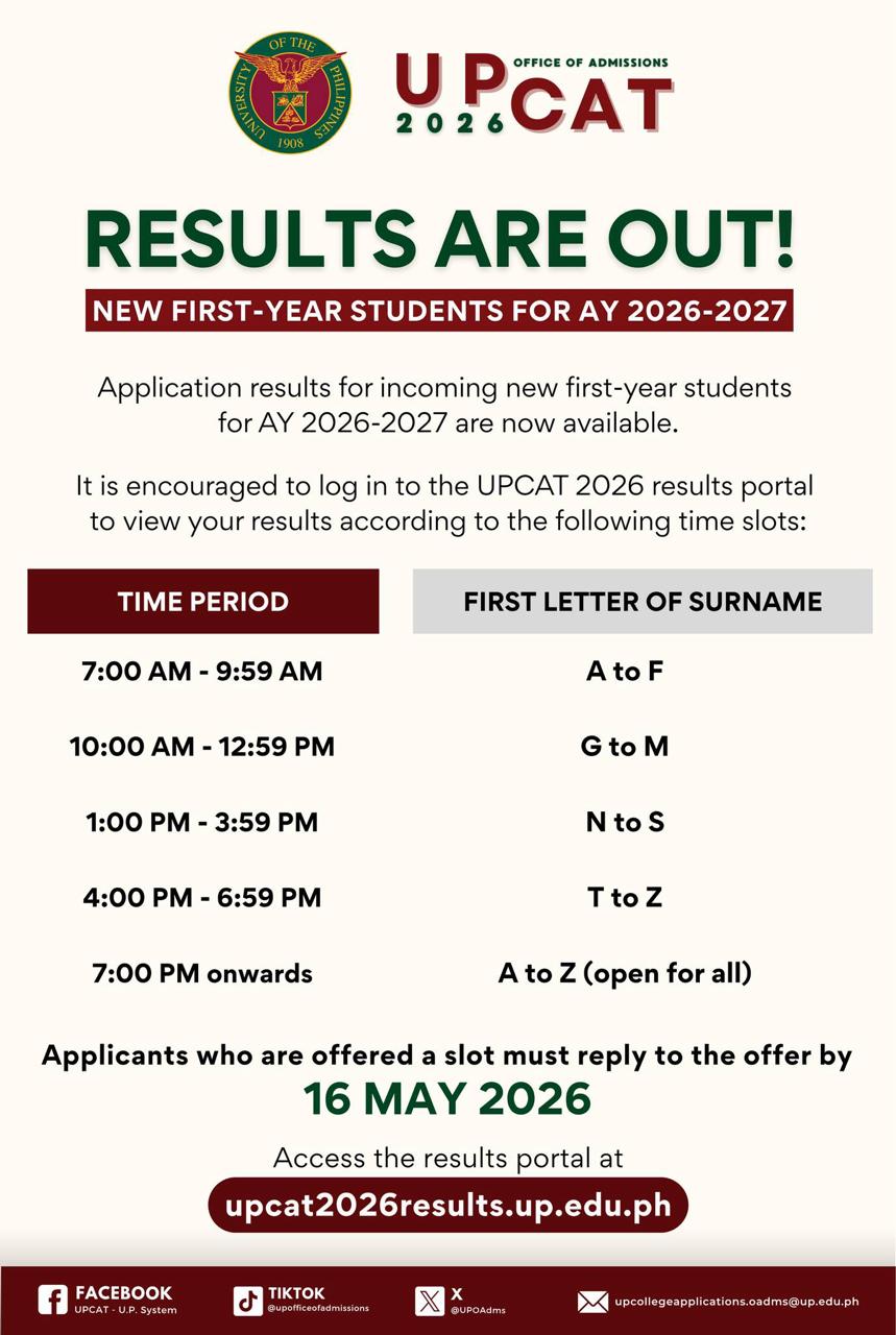 Ayon sa opisyal na pahayag ng UP, “The UPCAT 2026 results are now available for incoming new first-year students for AY 2026-2027.”