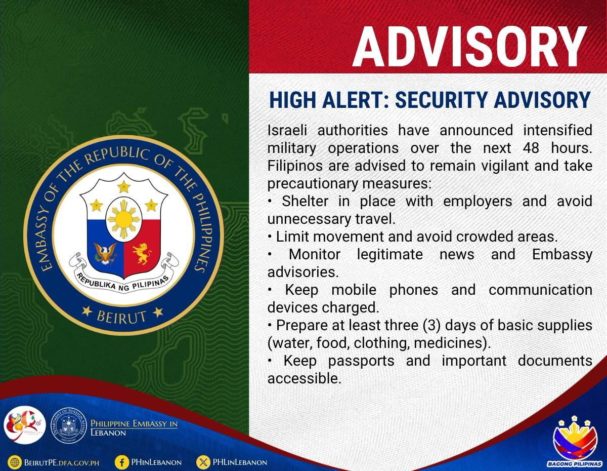 Kasabay nito, naglabas ang Philippine Embassy ng “high alert” security advisory kasunod ng anunsyo ng pinaigting na military operations ng Israel sa loob ng susunod na 48 oras.